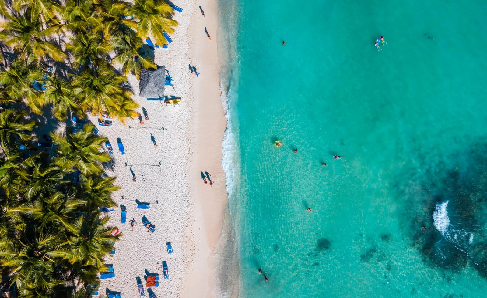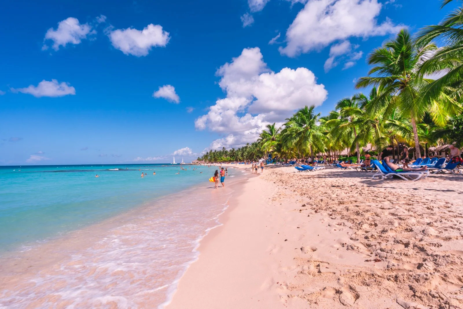 Sulla bellissima spiaggia di Playa Dominicus a Bayahibe, di sabbia fine di corallo bianco - rosa.